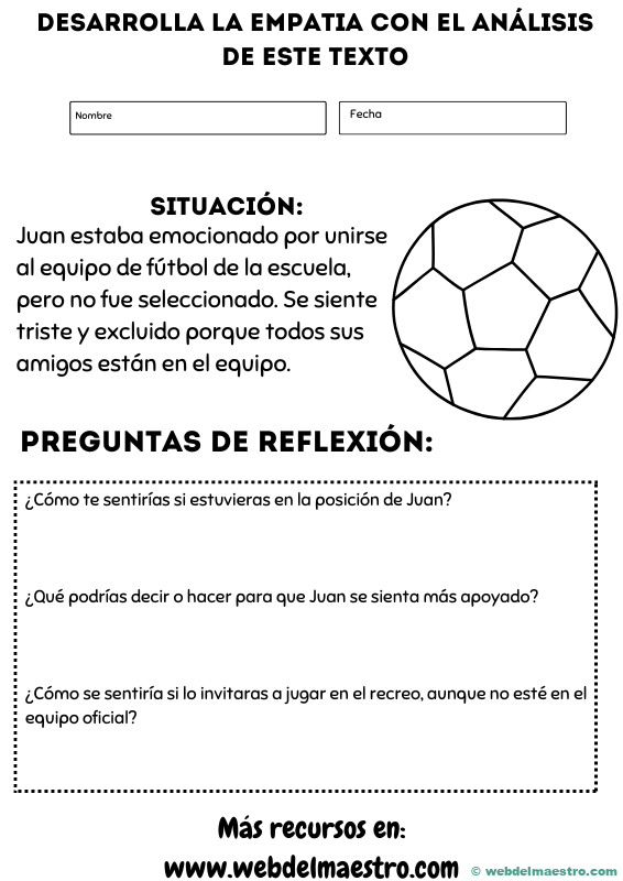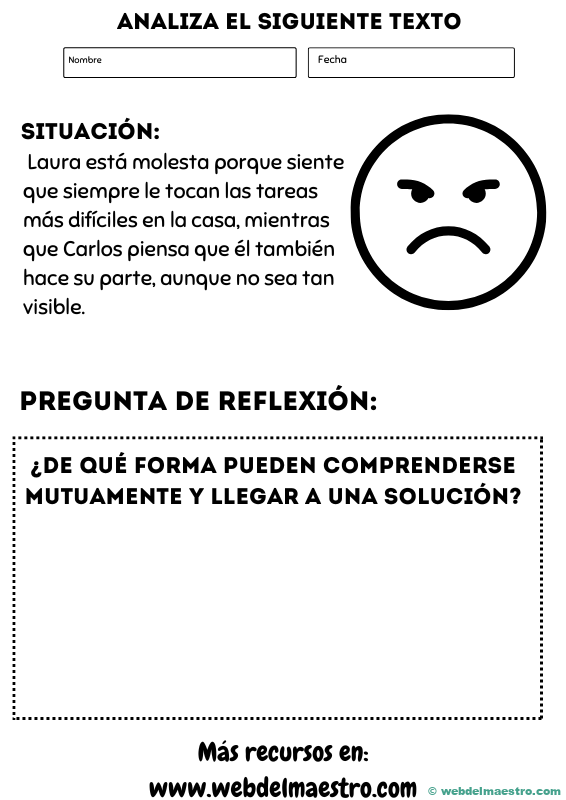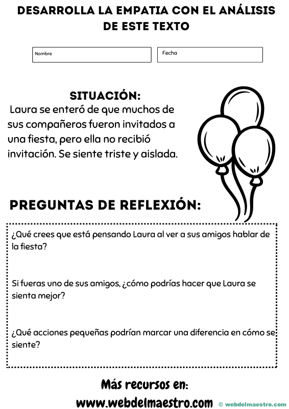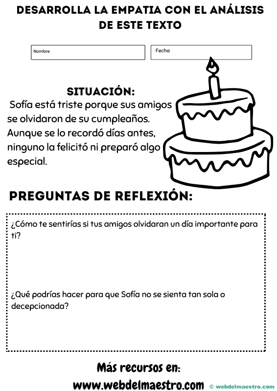 A través de las fichas, se busca que los niños practiquen cómo responder emocionalmente a las experiencias ajenas, desarrollando la capacidad de ponerse en el lugar del otro.