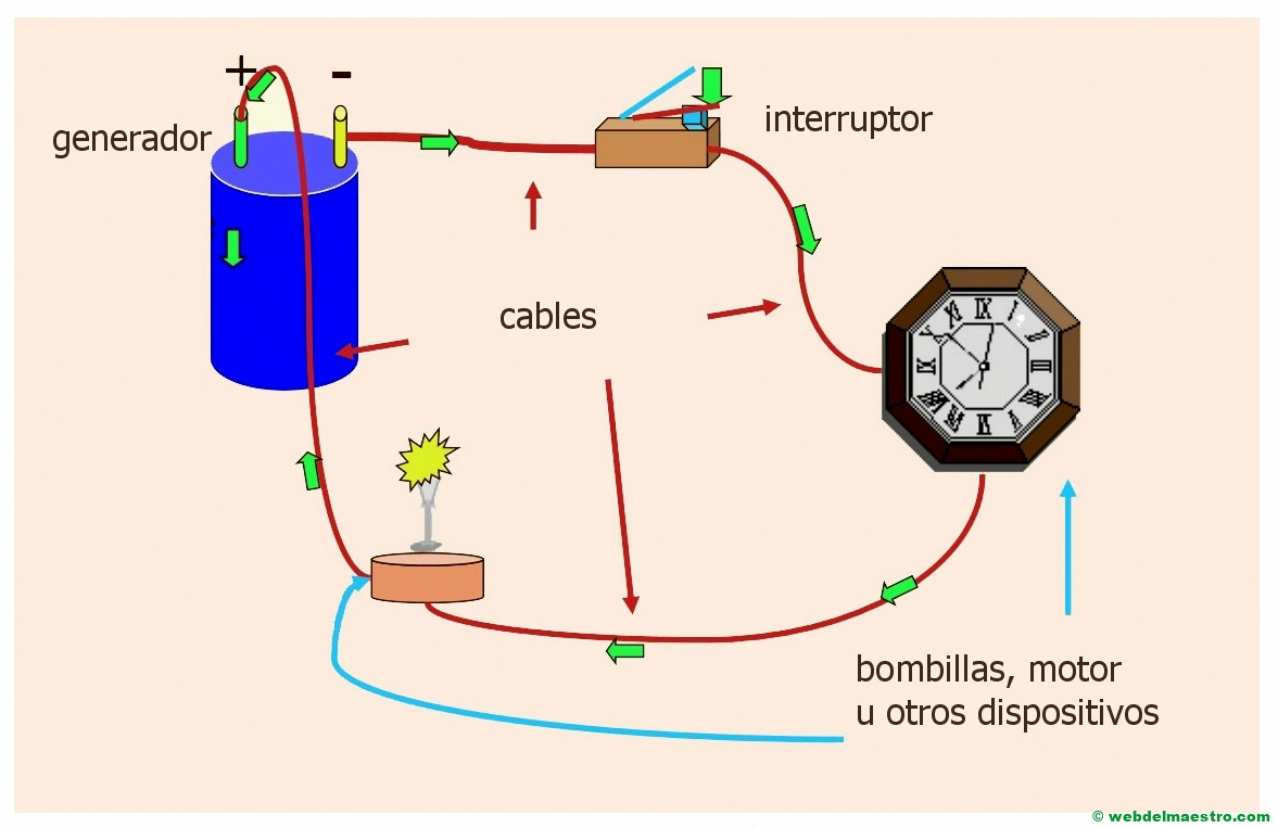 – El generador, que produce la corriente eléctrica. Puede ser una batería o pila, o una toma de corriente. La corriente eléctrica comienza y se detiene aquí.