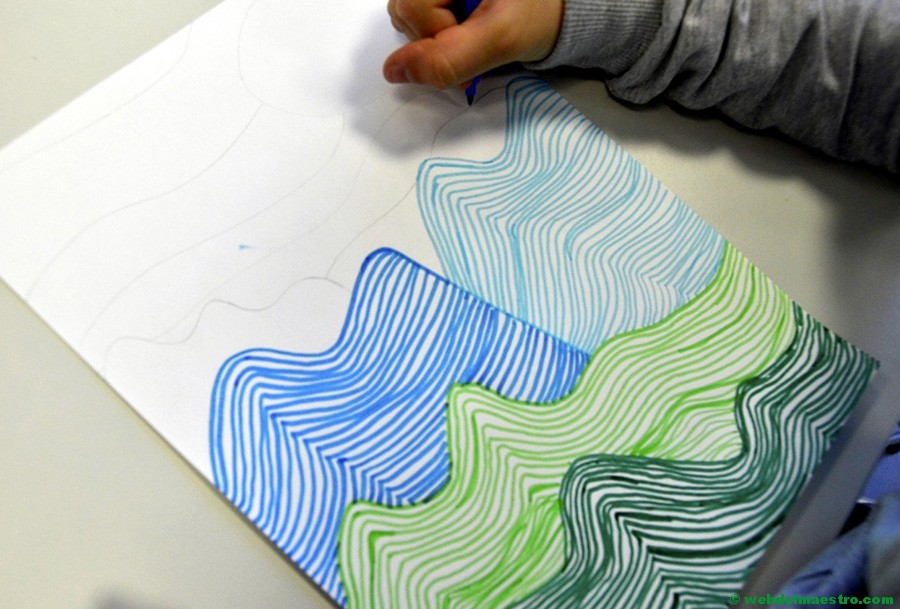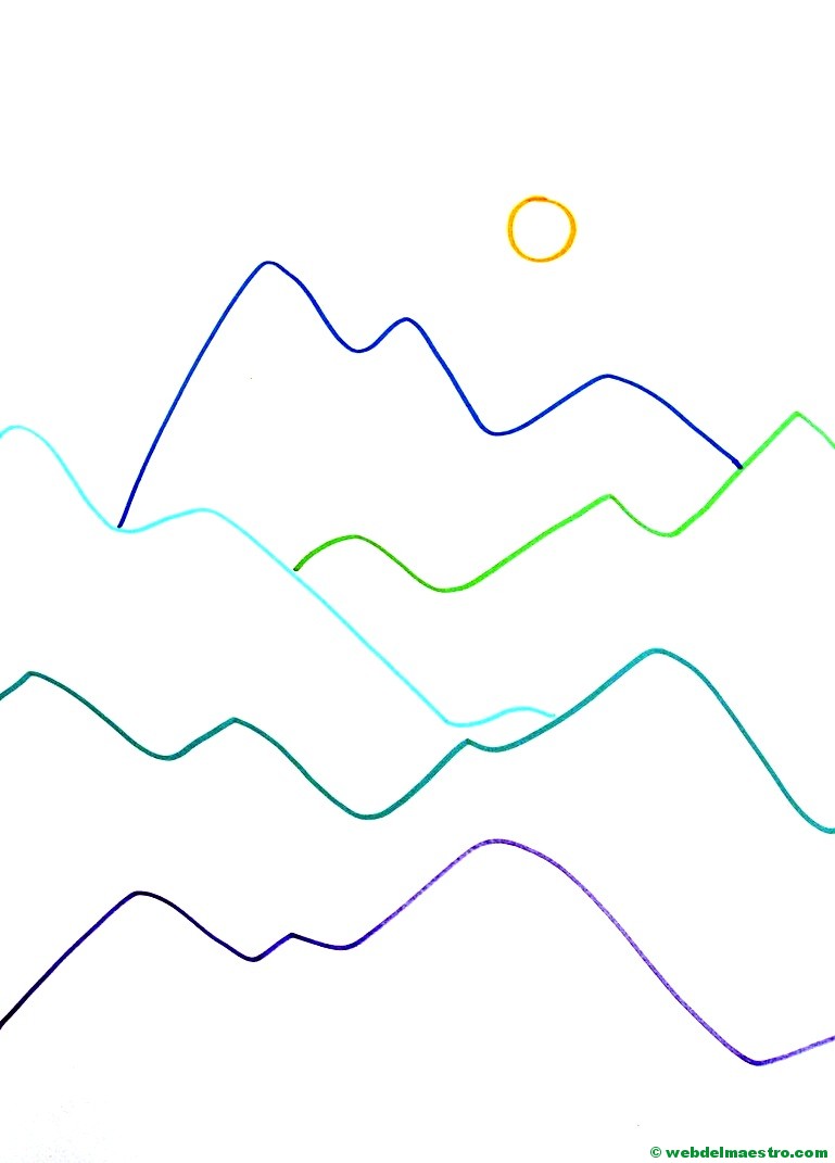 - Comenzaremos dibujando las siluetas de las montañas. Procuraremos utilizar un color diferente para cada montaña, con el fin de poderlas diferenciar.