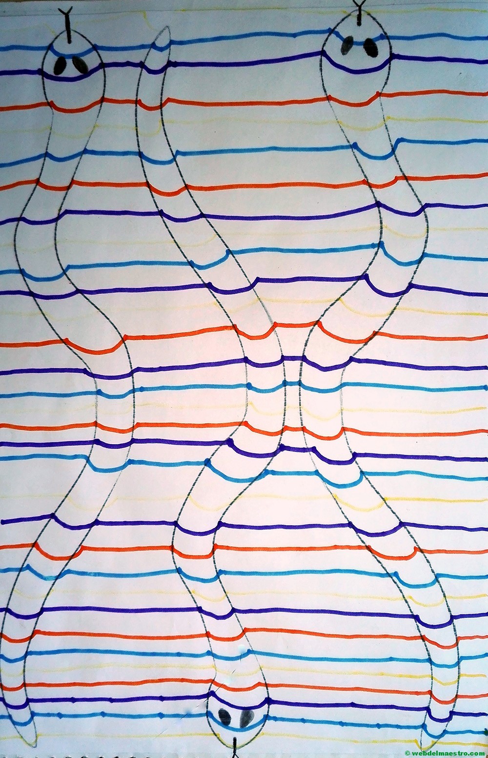 - Comenzar a trazar las líneas, que serán rectas al comienzo y al final, y curvas al dibujar el cuerpo de cada serpiente. Continuar el trazado de líneas paralelas hasta completar el dibujo.