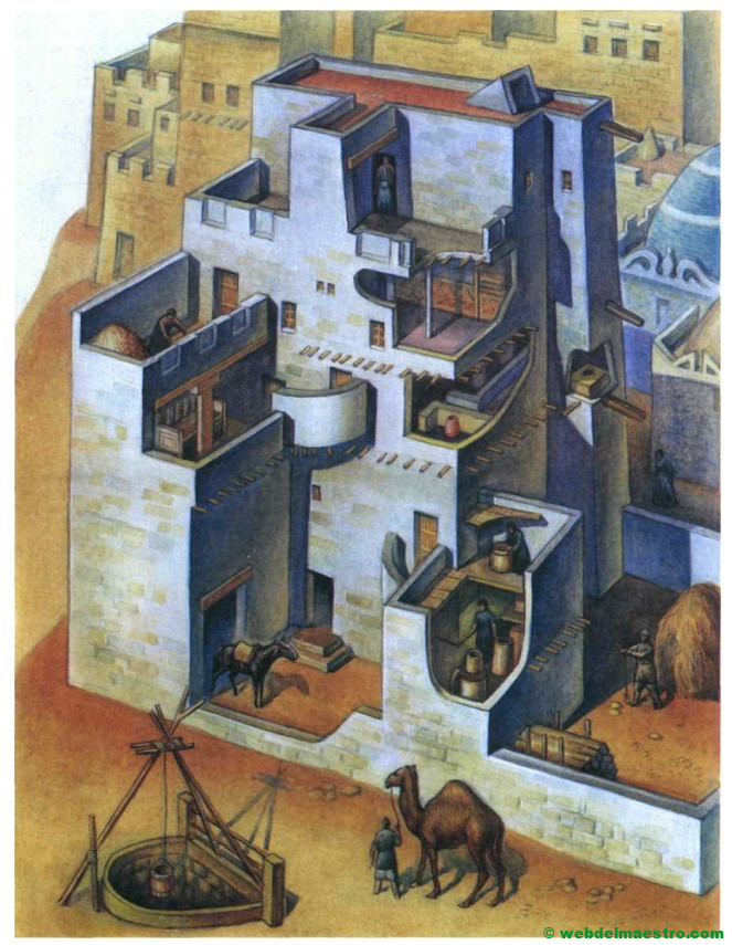 Las casas tenían uno o dos pisos y estaban formadas por habitaciones abiertas a un patio interior. De noche las casas se alumbraban con candelabros y velas de cera o sebo.
