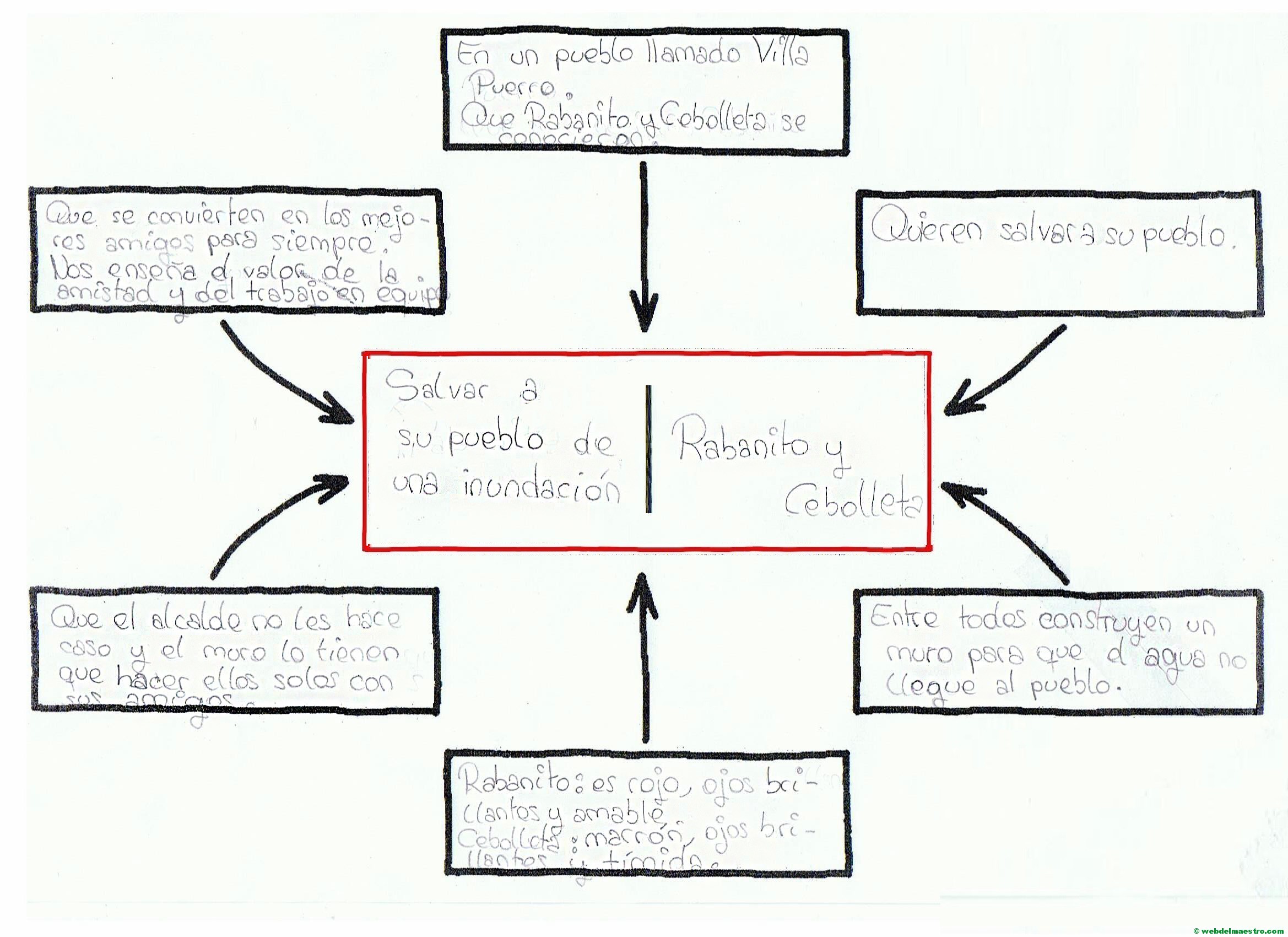 Este esquema resulta muy útil para organizar las ideas secundarias en torno a la idea principal o tema central del cuento. Os dejo la descargas de estas dos fichas debajo, así como un ejemplo de este organizador relleno por un alumno.