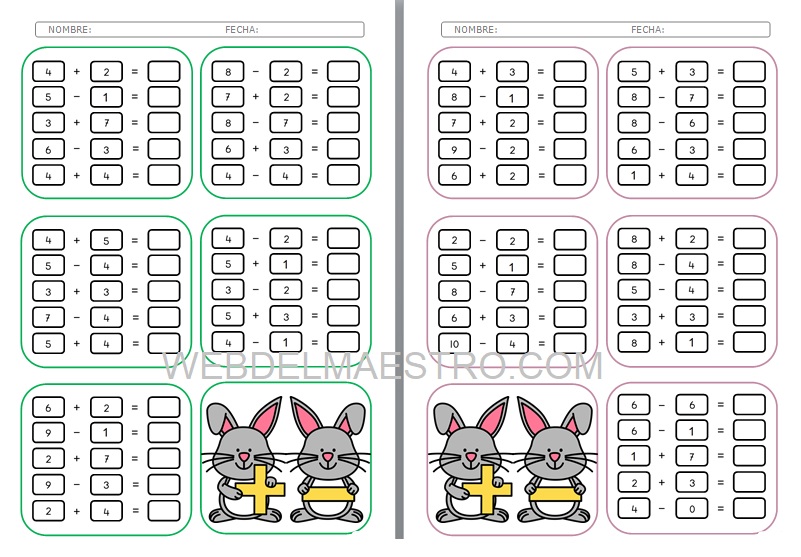 Estas operaciones básicas hasta la decena se pueden practicar con niños, bien en la última etapa de Infantil o en el periodo de adaptación de Primer Nivel de Primaria. Además, al final del archivo podéis encontrar las soluciones de las actividades.