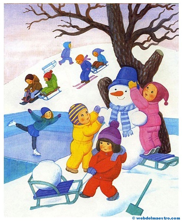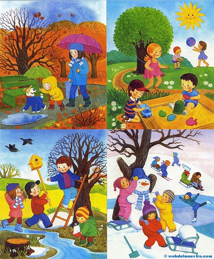 4º- Serie de imágenes infantiles sobre las cuatro estaciones del año en las que se utilizan muchos elementos lúdicos como eje motivador de la observación y del aprendizaje. En ellas aparecen los niños jugando y experimentando distintas situaciones en cada una de las estaciones, relacionándolas con la climatología, según van apareciendo los elementos del clima que caracterizan a cada una de las estaciones.