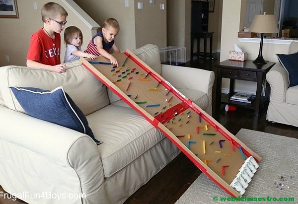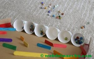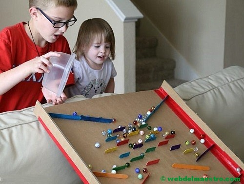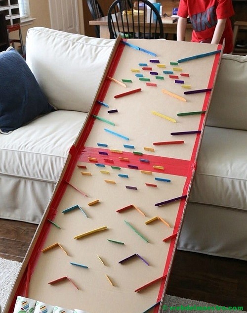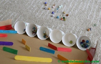 Para su elaboración aprovecharemos una caja grande de cartón abierta, de la que usaremos sus dos partes frontal y trasera. Pegaremos sobre ella palos planos de madera en color, distribuyéndolos sobre la superficie del cartón de una forma estratégica, para que las bolas puedan circular, y al fondo unos vasos de plástico.