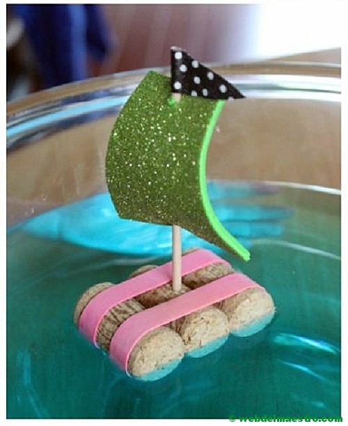 Como se aprecia en la imagen, para su montaje simplemente necesitaremos tres corchos, dos gomillas, un palillo de pinchito, un pequeño trozo de goma Eva para la vela y un banderín, el cual que se puede recortar de una bolsa de plástico.