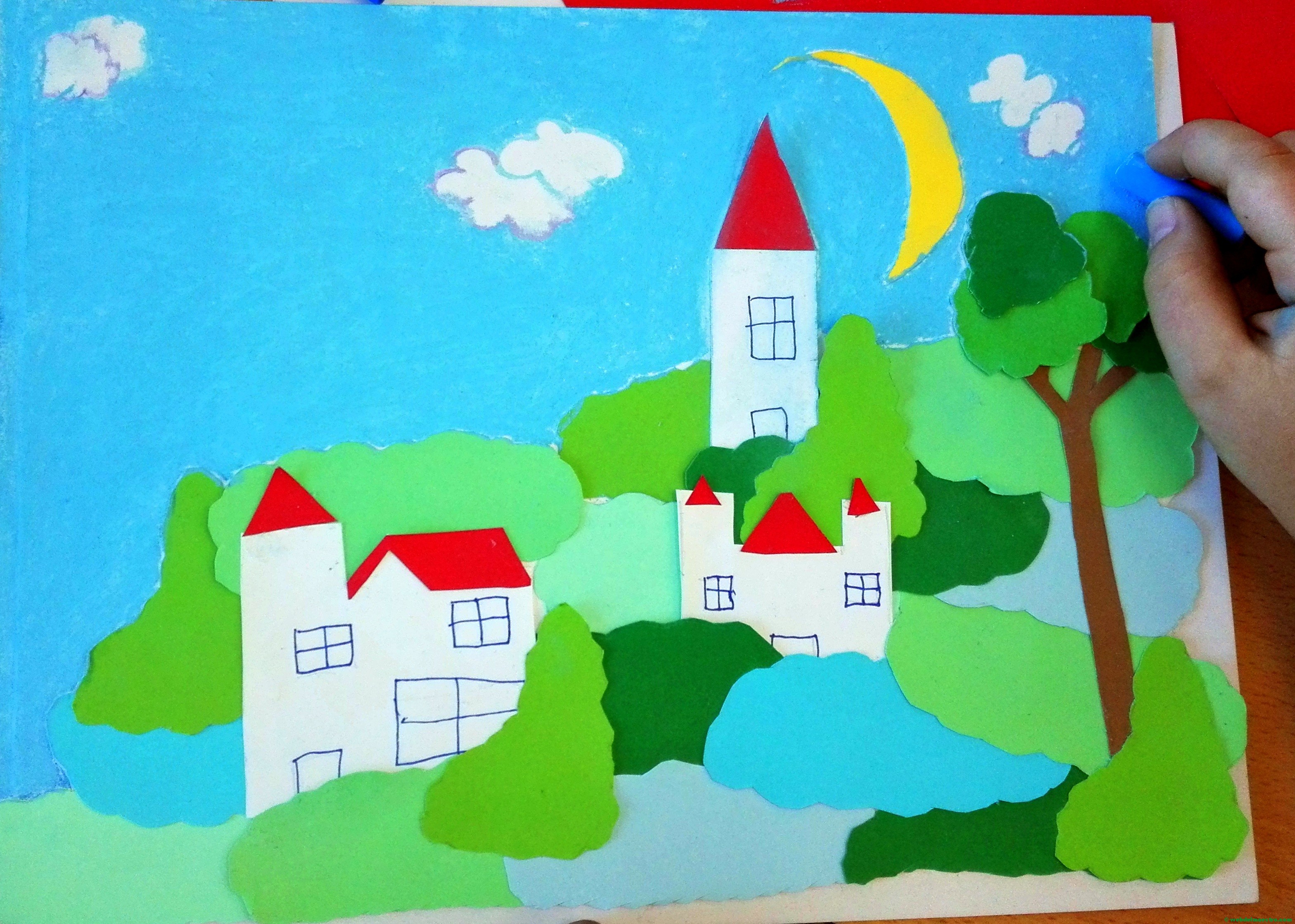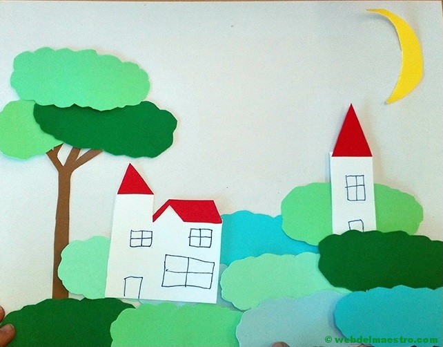 Todos los elementos recortados se van presentando y superponiendo -antes de pegarlos- en la superficie que se haya elegido, para asegurarnos de que la composición del paisaje nos gusta y queda bien terminada.