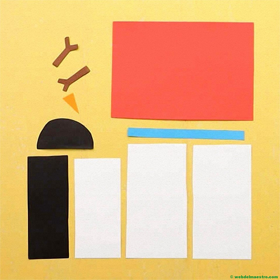 Cartulinas de colores, pegamento escolar de barra, gomets de distintos colores, formas y tamaños, y tijeras.