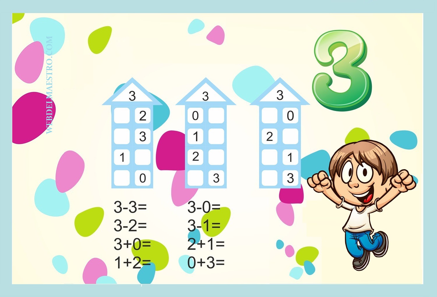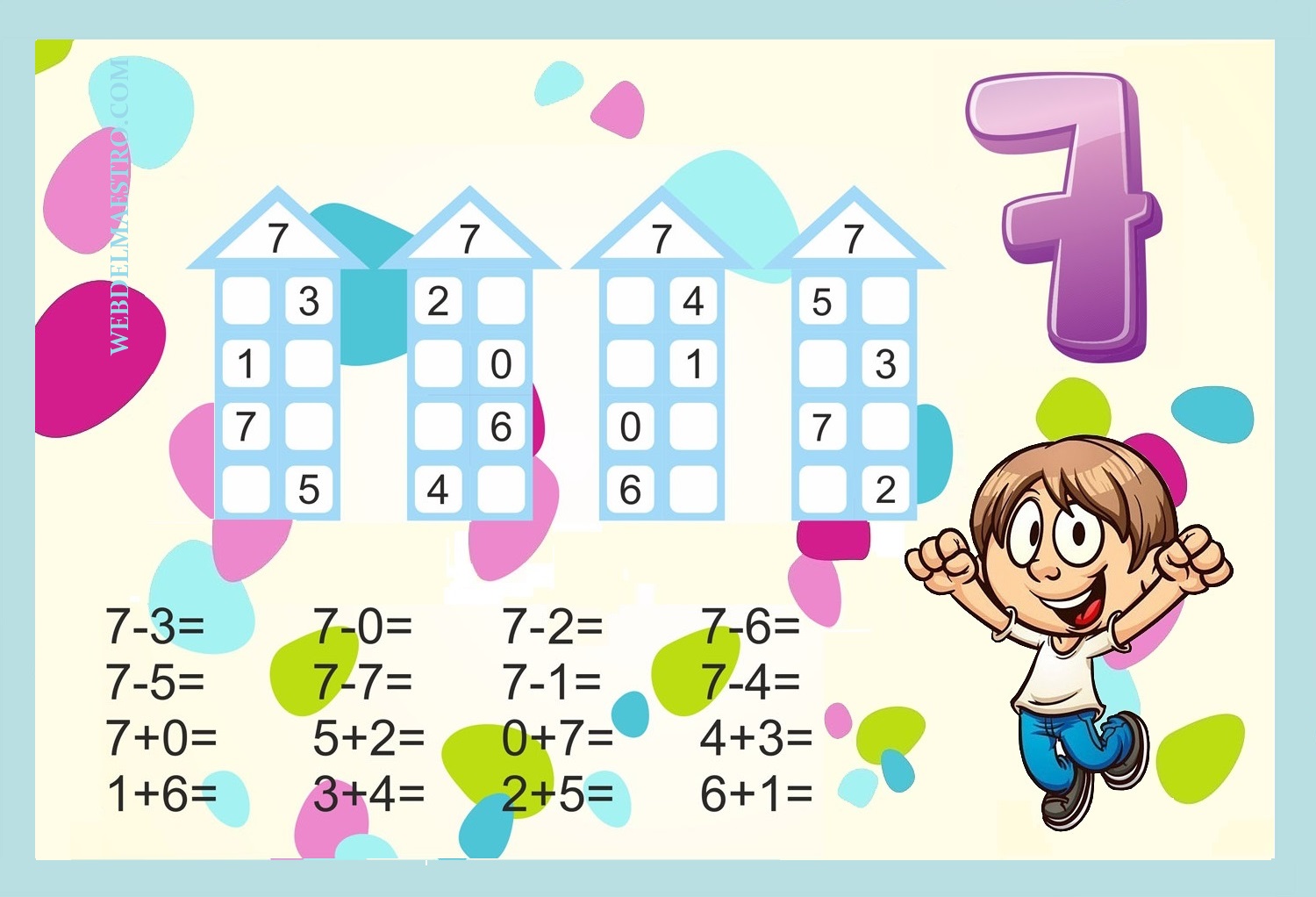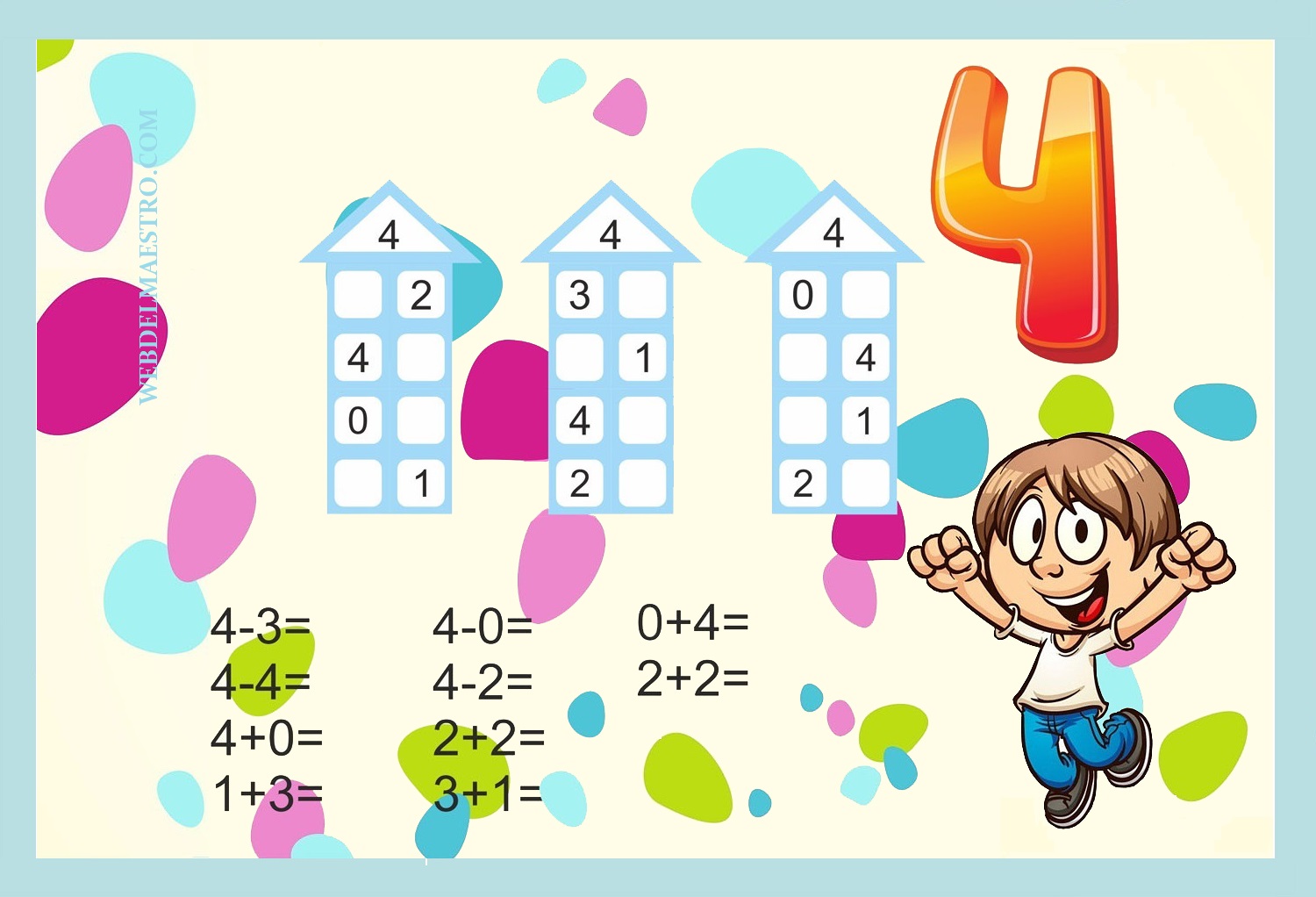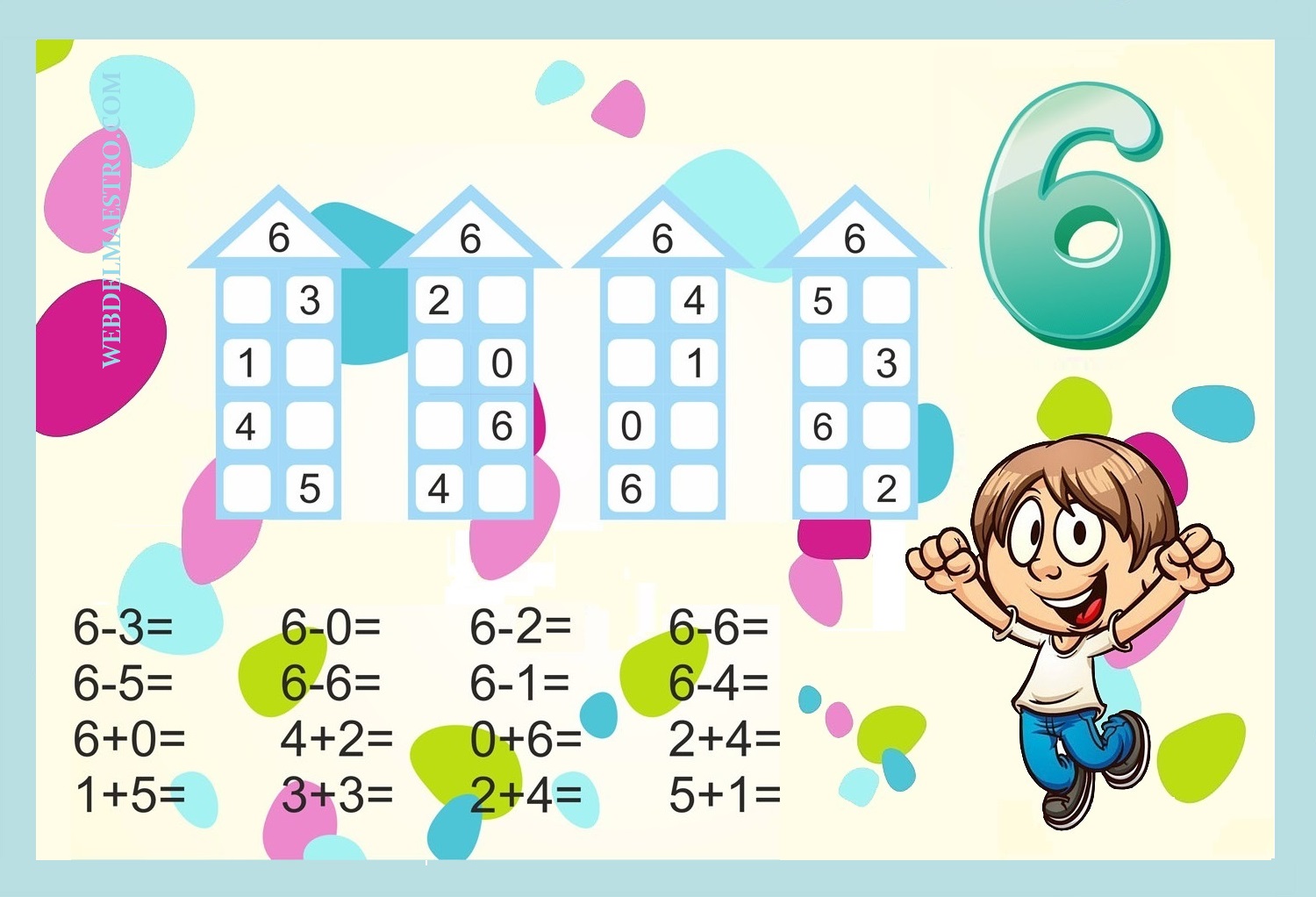 Las imágenes sobre actividades de descomposición de números que os dejo a continuación son un material estimulante y motivador, que permite a los niños/as practicar para aprender a descomponer números. Esta láminas se pueden utilizar muchas veces si colocamos encima del cartel una placa transparente sobre la que el niño/a puede escribir los resultados cuantas veces quiera, con rotulador que se pueda borrar. También se pueden plastificar para que el niño o niña practique sobre ella con rotulador borrable.