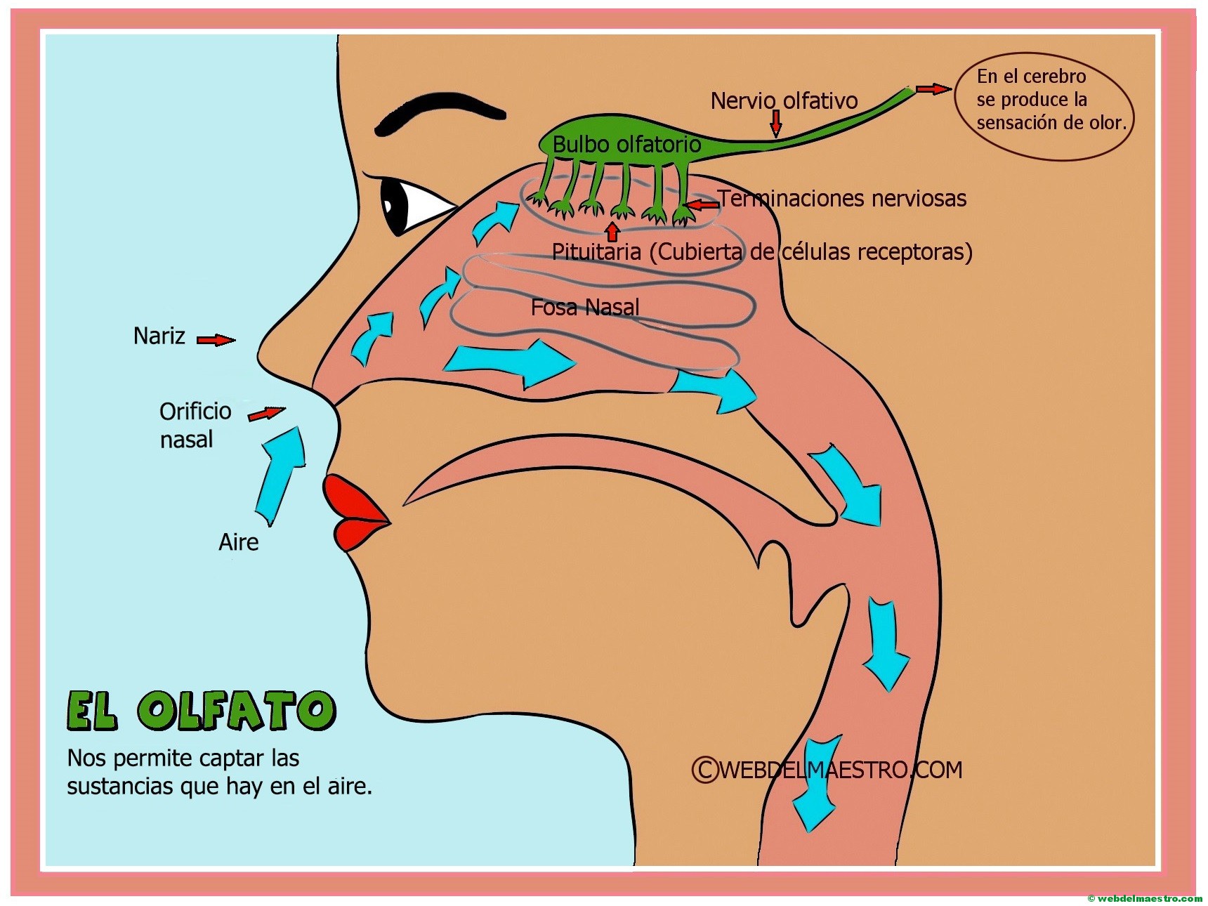 Los olores se encuentran en el aire y viajan a través de él. El aire con sustancias entra por los orificios nasales y llega hasta la pituitaria. Ésta se encuentra recubierta de células receptoras, que captan las sustancias que hay en el aire.
