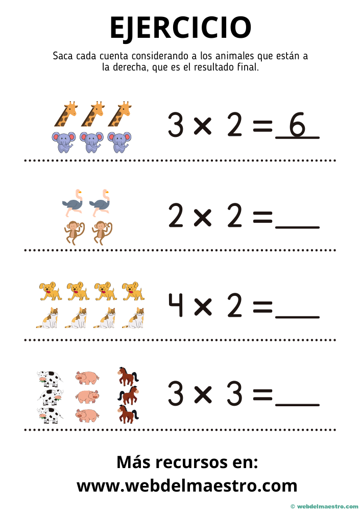 Este tipo de ejercicios también les ayuda a ver la relación entre la multiplicación y la suma repetida, facilitando su comprensión. Por ejemplo, al practicar la tabla del 2, los niños pueden entender que multiplicar 2 x 4 es lo mismo que sumar 2 cuatro veces. Además, las fichas con imágenes o elementos visuales son especialmente efectivas para que los niños asocien la multiplicación con situaciones de la vida real, como contar objetos o agrupar elementos.