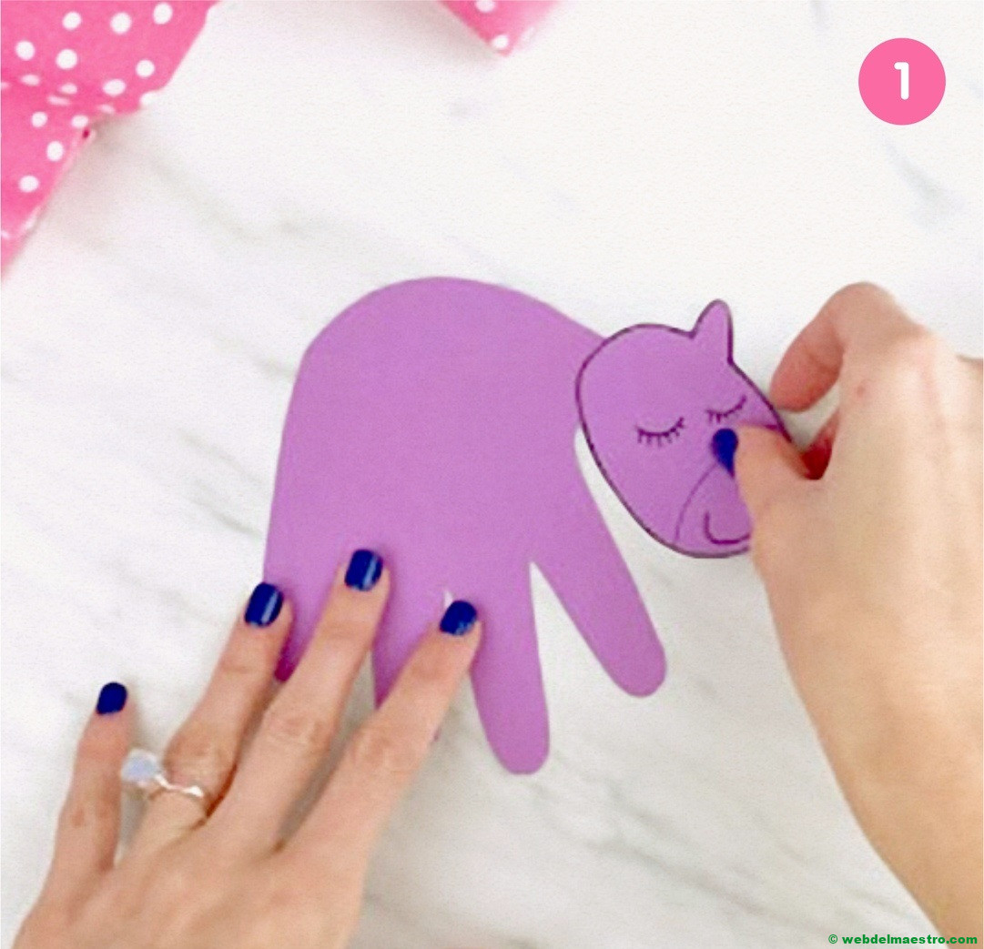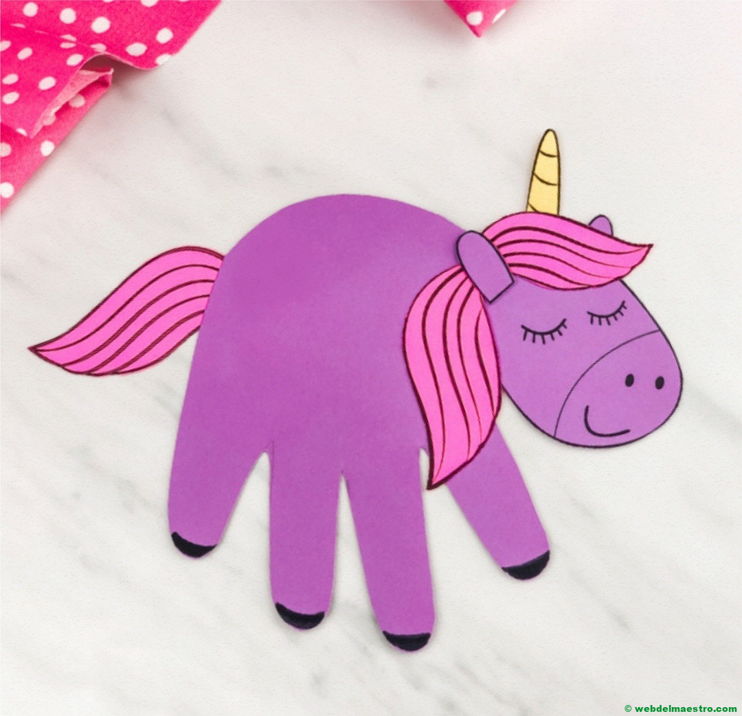 Para realizar este unicornio de papel comenzaremos por pedir al niño/a que dibuje la silueta de su mano sobre un folio de color, colocando ésta en posición bien abierta. Podemos ayudarle en esta tarea, si no lo logra hacer bien solo.