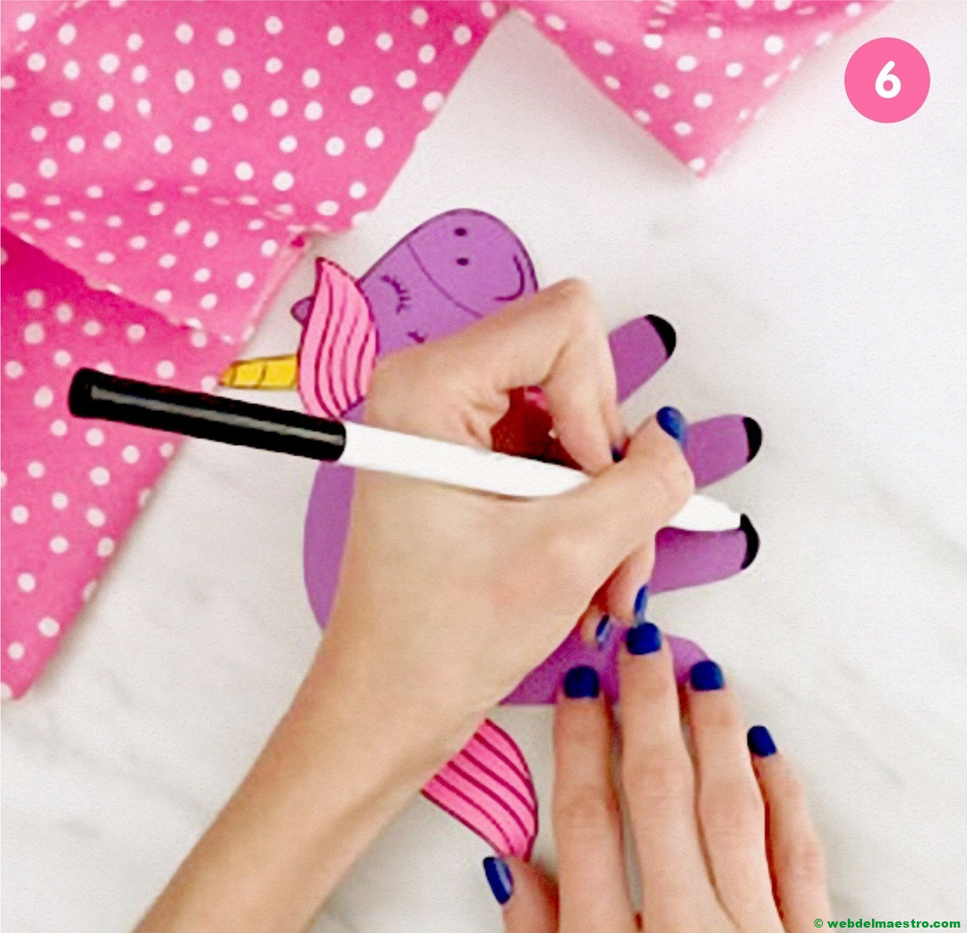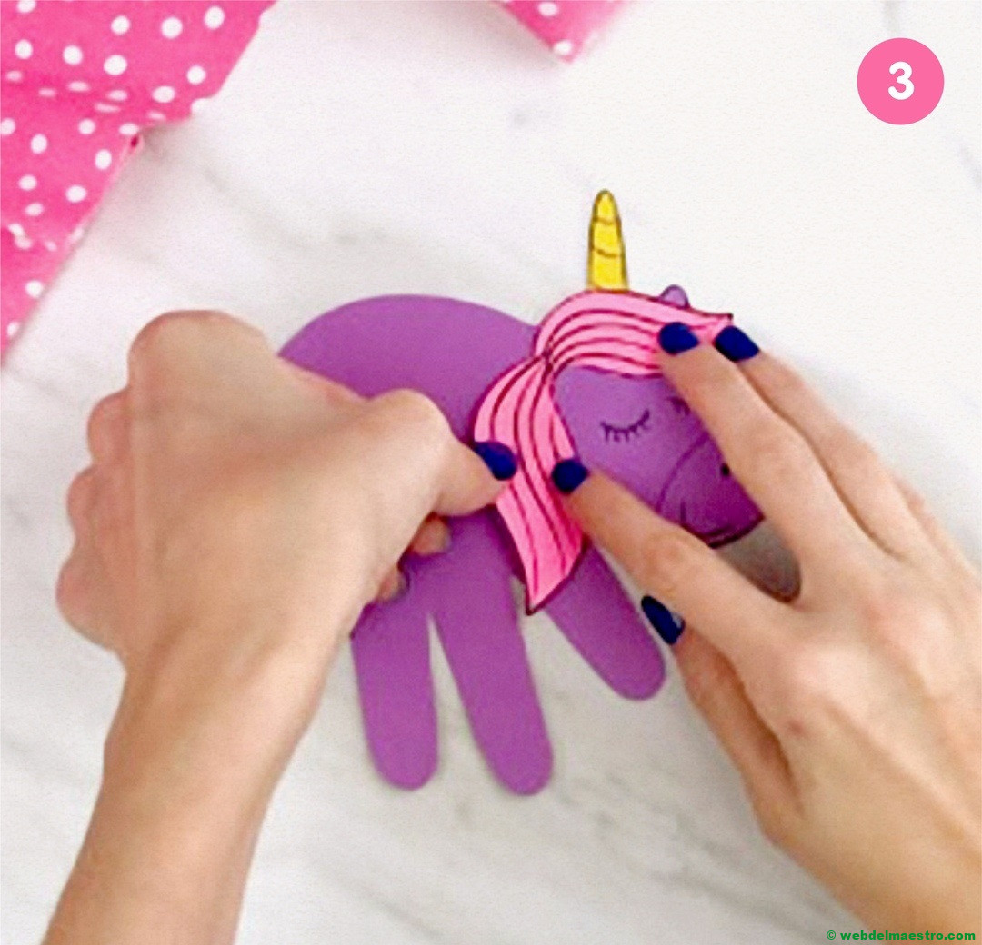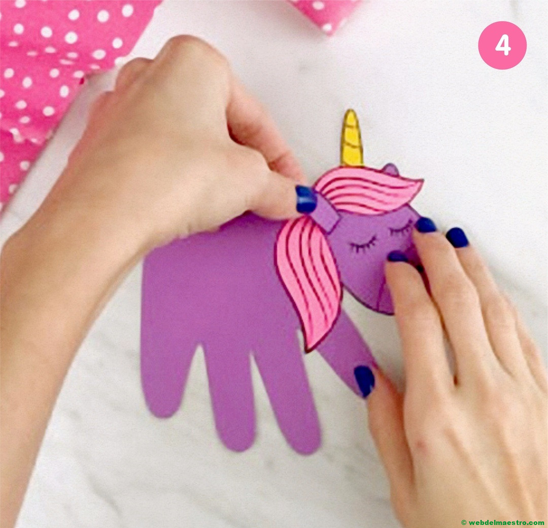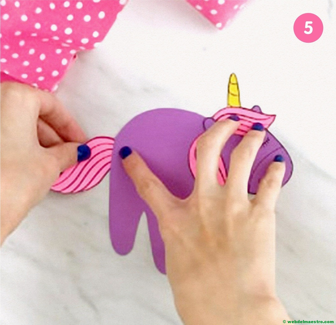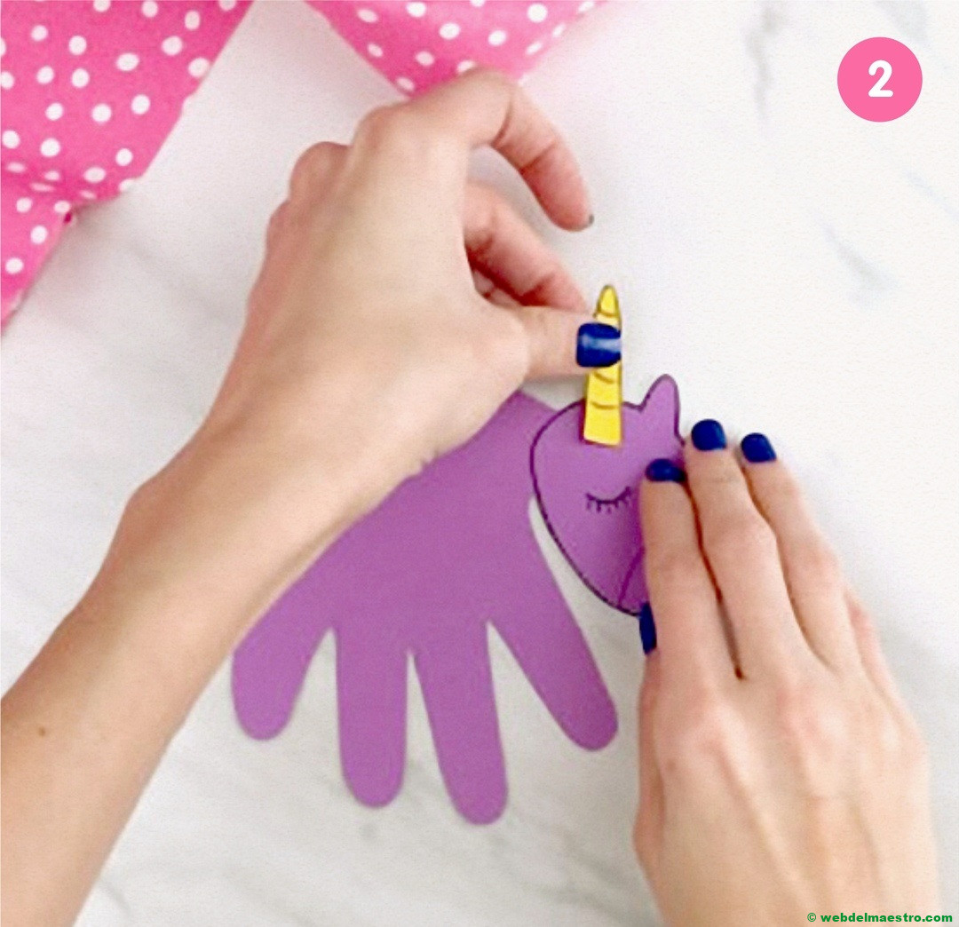 Pegar la cabeza del unicornio encima de la silueta del dedo pulgar.